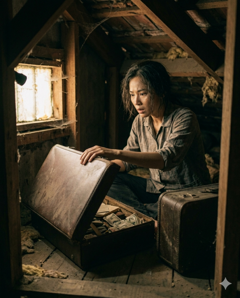 Trèo lên xem, có hai chiếc vali da kiểu cũ nằm im lìm trong góc.